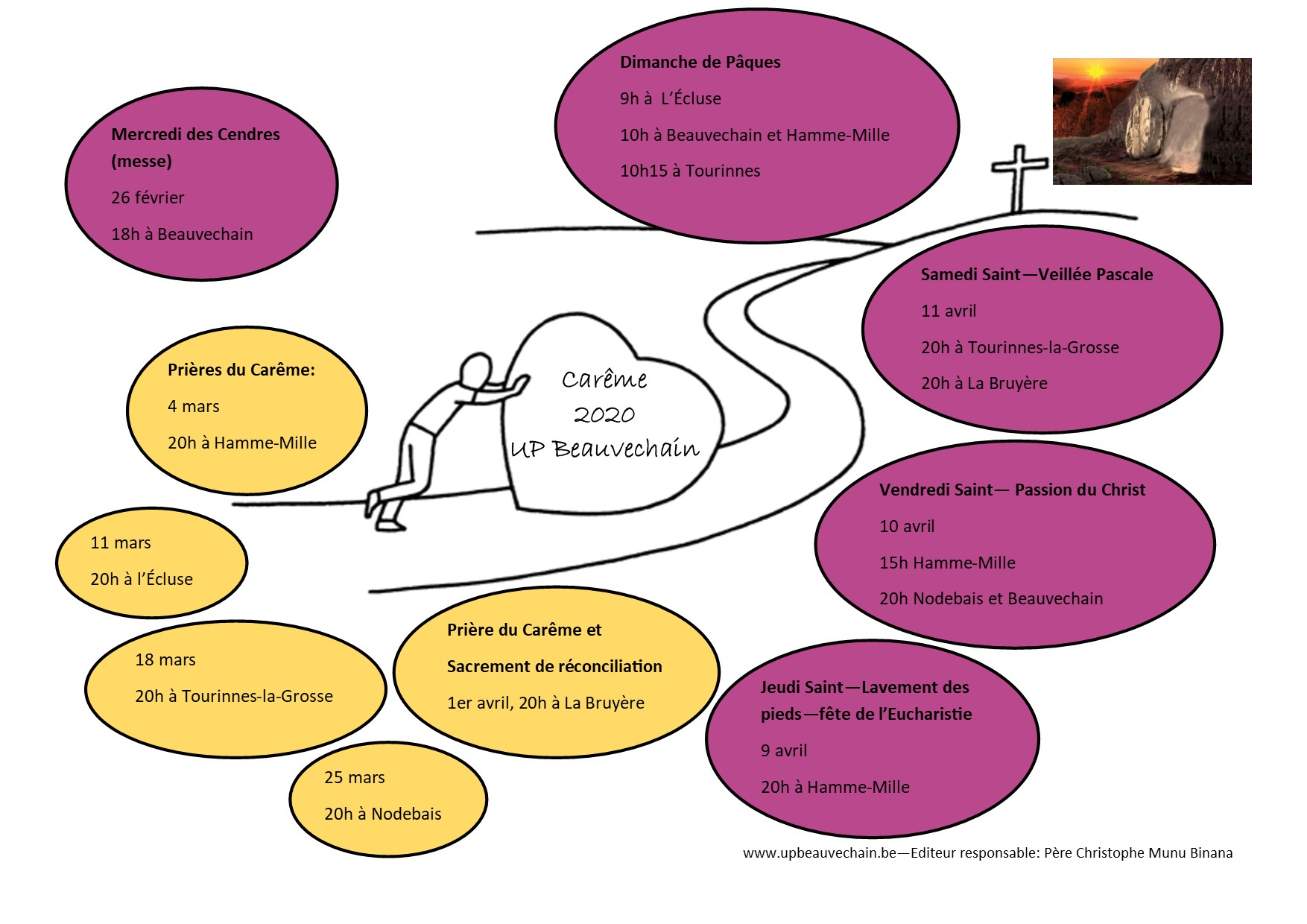 Une chouette idée que ce « chemin de Carême » qui reprend visuellement toutes les activités et célébrations du Carême et de la Semaine sainte : bravo à Maïté, de l’UP de Beauvechain ! J’ajouterais volontiers la messe chrismale à Nivelles, le mercredi 8 avril à 18h (voire la marche chrismale pour les confirmands…) !