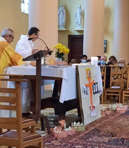 À l’occasion de notre messe des familles en UP (Pôle KT), de novembre à Nodebais, plus de 80 participants (dont de nombreux enfants) ont fêté avec ferveur et enthousiasme le Christ-Roi de l’Univers qui s’est ‘’ coupé en quatre ‘’ pour nous…. Au cours de cette célébration à la gloire de Dieu, rehaussée par de très beaux chants, les jeunes du caté qui ont présenté de petites saynètes illustrant les différences entre la royauté du Christ et la royauté terrestre. Ils ont également déposé autour de l’autel, lors de la procession d’offrande, les couronnes qu’ils avaient confectionnée (représentant la royauté terrestre) et ont reçu en échange un petit badge représentant une main ouverte portant la devise « Servir », mot d’ordre de la royauté céleste.