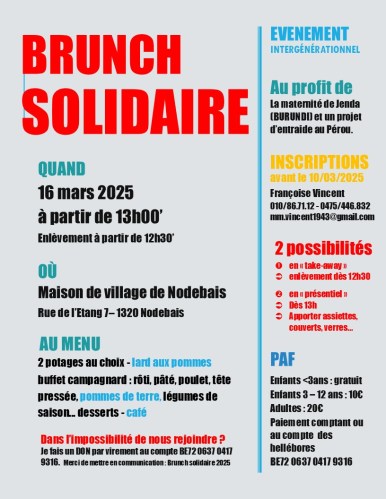 Je voudrais également souligner notre action locale qui se déroule à Nodebais depuis plus de 20 ans. On l’appelle BRUNCH SOLIDAIRE. Chaque année, nous aidons principalement la maternité de l’hôpital de Jenda (Burundi). Cette année, notre Archevêché nous propose le Pérou, – dans notre équipe de catéchistes, nous avons une jeune maman catéchiste