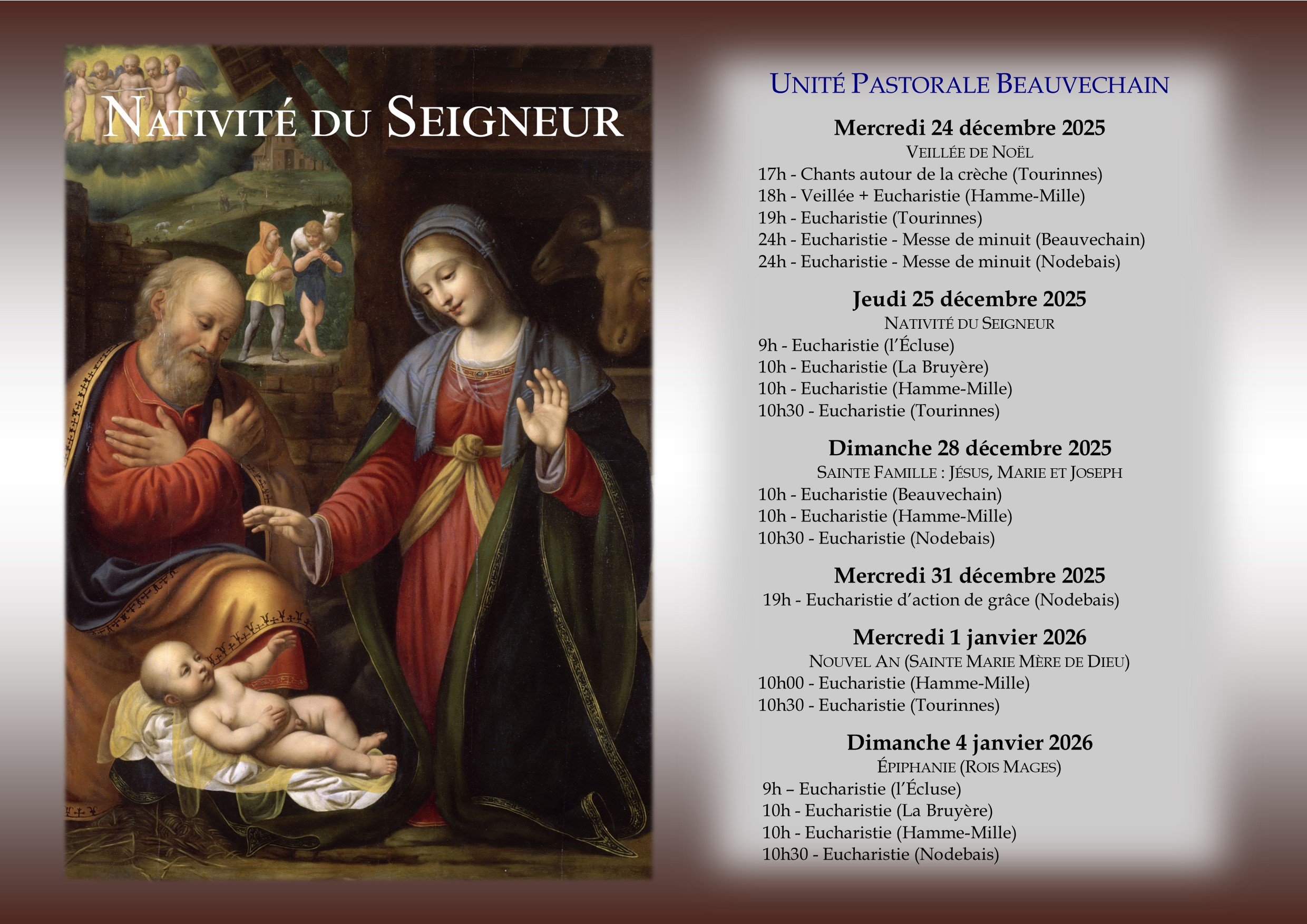 Dans cet esprit, nous invitons chaleureusement tous les fidèles à participer aux célébrations de la Nativité du Seigneur prévues dans l’ensemble des églises de notre Unité Pastorale.