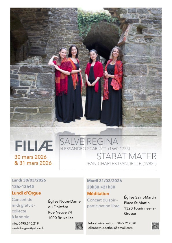 Elisabeth Goethals, membre de l’ensemble baroque « FILIAE » et paroissienne de Tourinnes, nous propose un nouveau concert spirituel de « FILIAE » pour vivre le Triduum pascal et nous préparer à Pâques.
