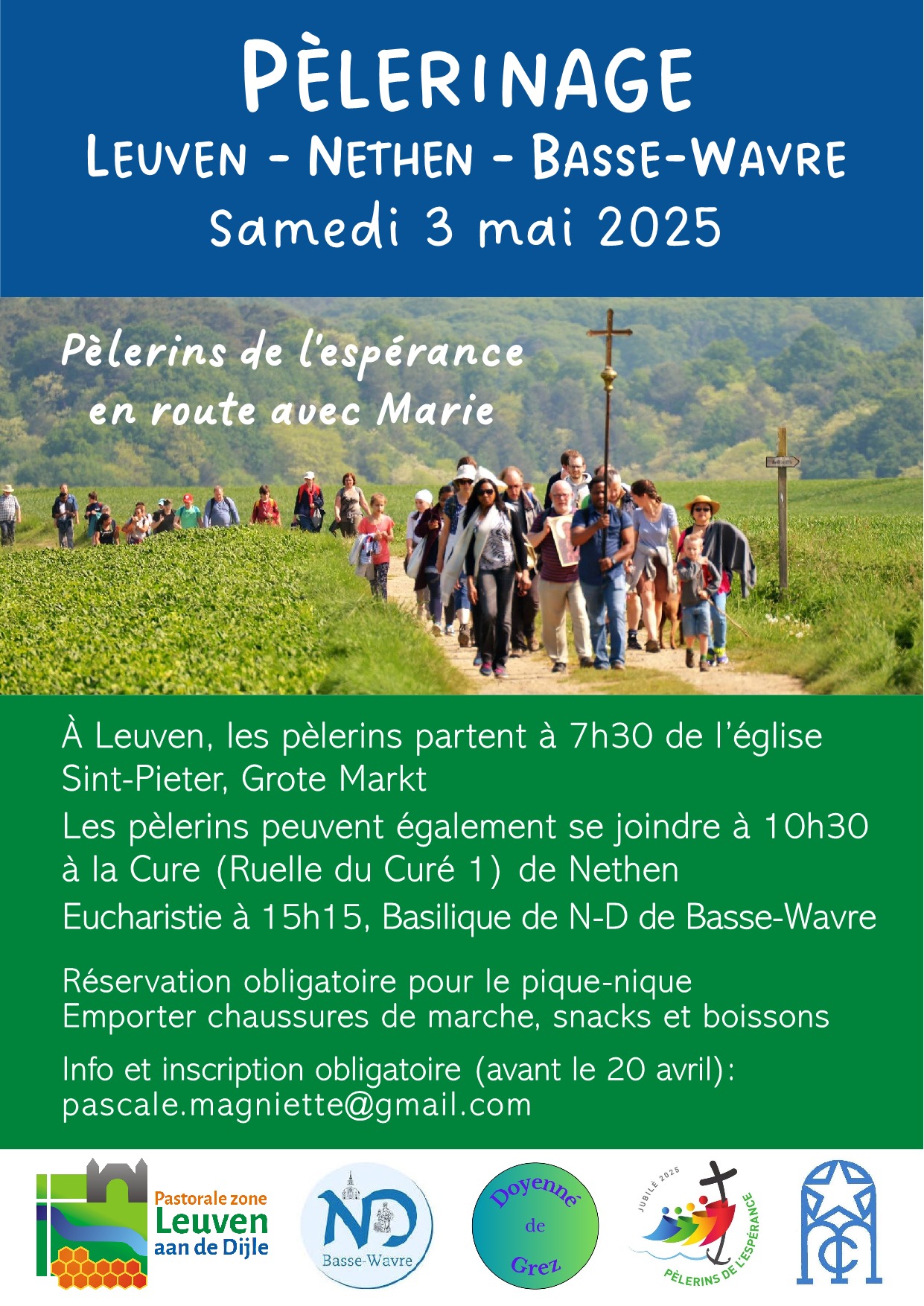 Le pèlerinage aura lieu le samedi 3 mai au départ de Leuven jusqu’à Basse-Wavre en reliant ainsi 2 églises jubilaires et en s’inscrivant dans la démarche jubilaire. Tout au long de la journée, possibilité de recevoir le sacrement de réconciliation dans les 3 langues, dans les 3 églises, en marchant. Le pèlerinage se fait à pied (21 km), à vélo (2 X 26 km) ou en voiture (20 km) suivant un programme adapté pour chaque mode de transport. A Nethen, un arrêt est prévu à la cure (Ruelle du Curé, 1) pour les marcheurs et les cyclistes pour un temps d’enseignement dans les 3 langues), de prière et un repas. Les paroisses du doyenné de Grez rejoindront au fur et à mesure le groupe des pèlerins (à Leuven, à Nethen, à la Chapelle Robert, à Basse-Wavre). A 15h15, messe chantée à Notre-Dame de Basse-Wavre dans les 3 langues (néerlandais, français et anglais avec traduction sur écran), présidée par le Père Ghislain Kasereka (Montfortain) – Le pèlerinage est gratuit.