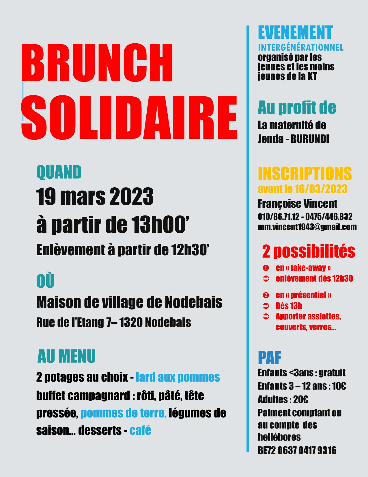 Notre projet local de solidarité, c’est le DÎNER DE CARÊME – BRUNCH SOLIDAIRE, le 19 mars, donc le dimanche prochain, organisé depuis environ 13 ans au sein de la paroisse de Nodebais. Cette action a été lancée pour la première fois à Nodebais il y a 13 ans, après le tremblement de terre à Haïti. Donc, en 2023, ce sera la 14ème édition. Il s’agit bien d’un repas solidaire, toutes générations confondues, et d’un repas de Carême de partage.