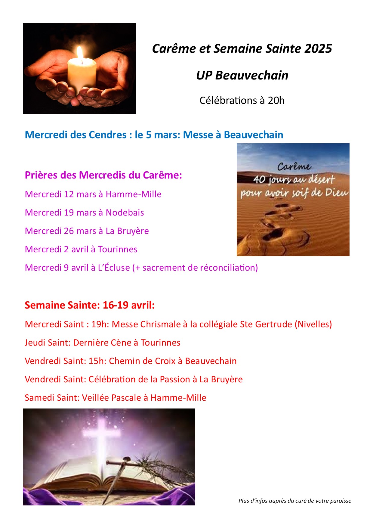 Ce mercredi 5 mars, nous démarrons le Carême avec la Messe du Mercredi des Cendres. Cette année, la célébration des Cendres se vivra avec toute l’unité pastorale à Beauvechain à 20h.