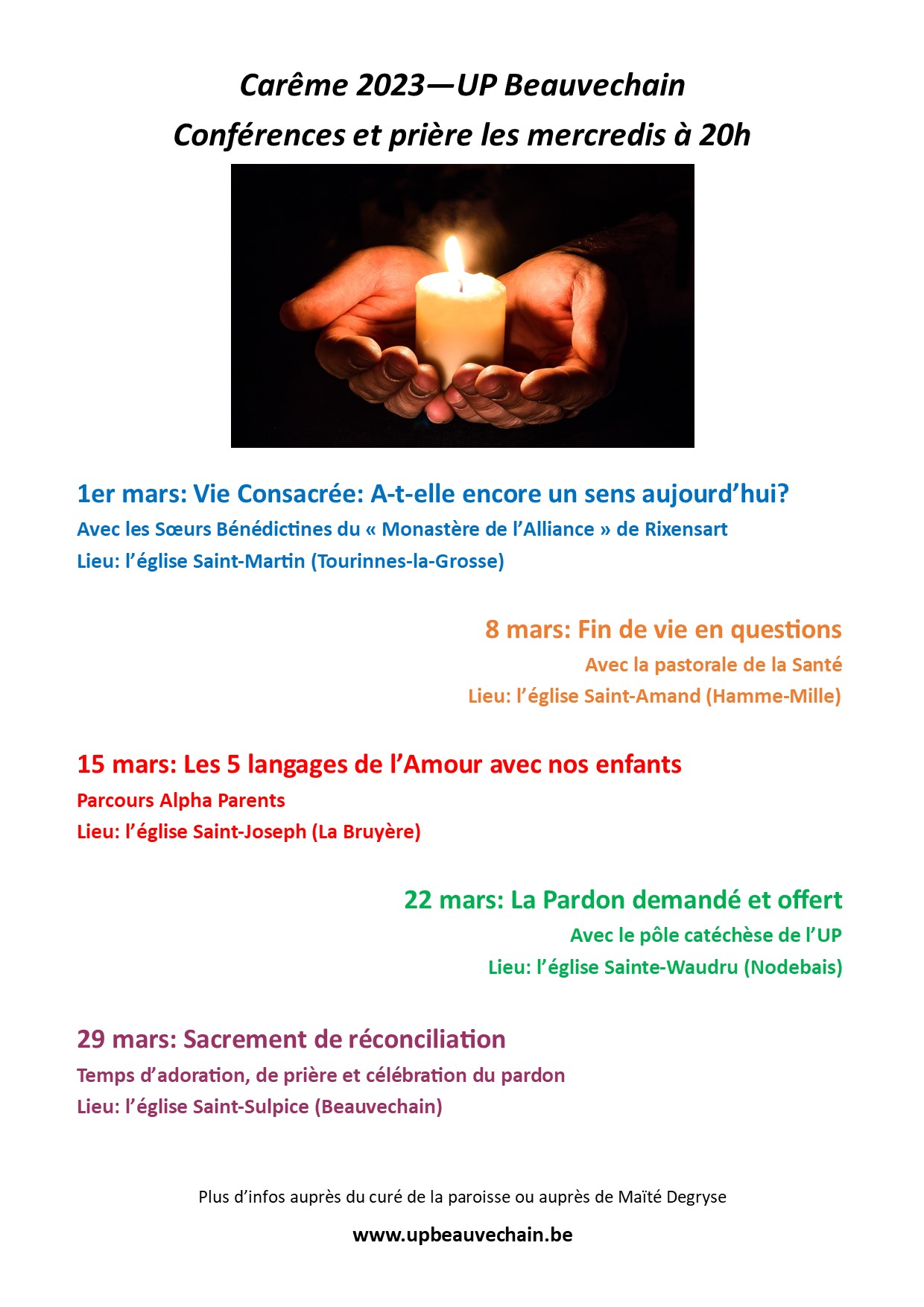 Mercredi 29 mars: Dernière rencontre de Carême. Temps de sacrement de réconciliation pour ceux qui le souhaitent lors d’une soirée de prière à l’église Saint-Sulpice de Beauvechain. Rendez-vous de 20h à 21h.