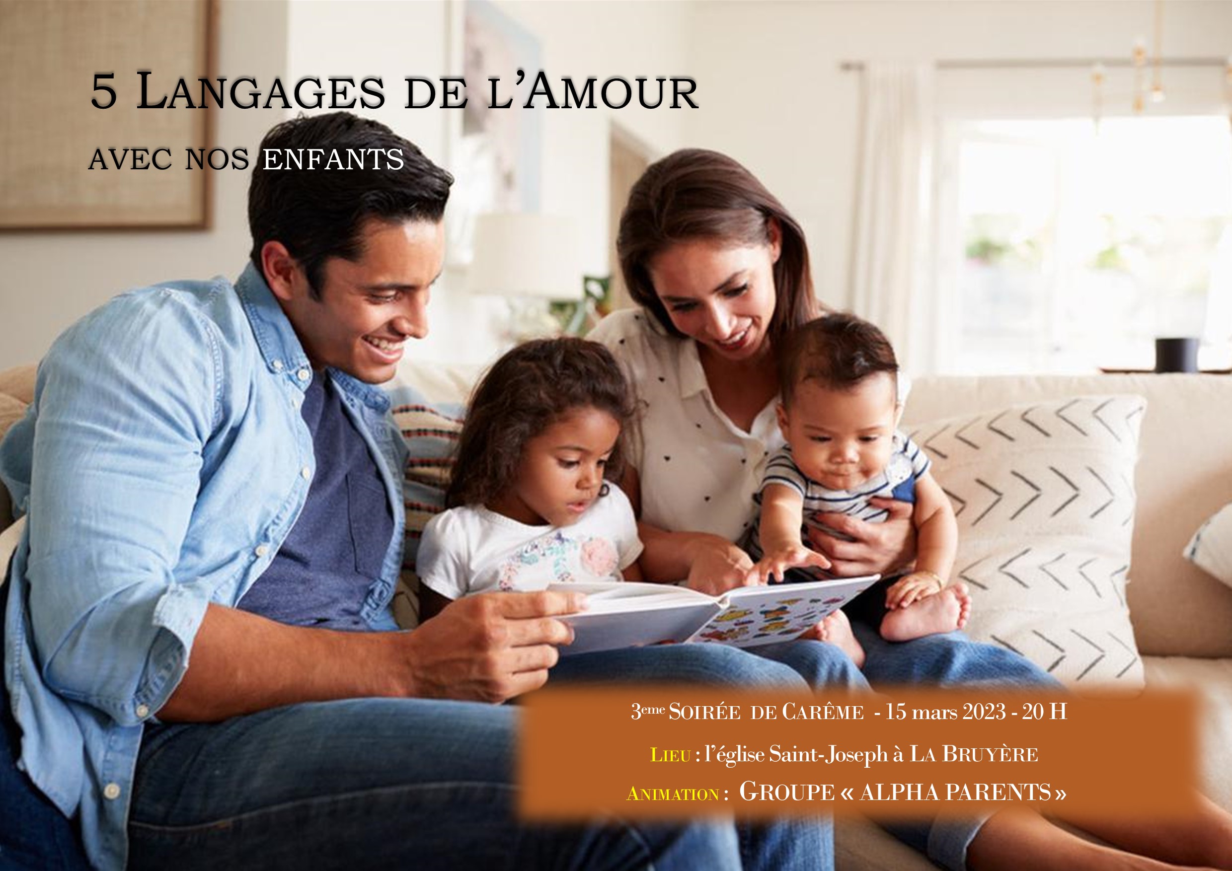 Mercredi 15 mars:Les 5 langages de l’Amour avec nos enfants. Une soirée du parcours Alpha Parent: un parcours pour accompagné la parentalité. Rencontre et témoignage avec Georges Bouchez, animateur pour les parcours Alpha Parent. La soirée permettra des échanges entre parents pour grandir dans notre parentalité. La rencontre aura lieu à l’église Saint-Joseph de La Bruyère de 20h à 21h15. Bienvenue à tous.