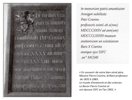 « Pour honorer la mémoire de leur vénéré Père, une des personnalités qui illustrèrent, dès le début, notre Faculté de Médecine, le baron et la baronne Craninx nous ont fait don d’une somme importante destinée à l’enseignement de l’anatomie. Elle nous mettra à même d’organiser définitivement un musée scientifique, où se complètera le travail commencé par l’élève dans la salle de dissection. NN.SS. les Evêques, dans leur réunion du mois de juillet, ont décidé de donner au musée le nom du Dr. Craninx et de consacrer le souvenir de la fondation par une plaque commémorative. »