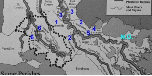 Après un long périple qui l’a mené depuis 1831 à travers plusieurs paroisses de la Basse Louisiane, tel que repris sur la carte suivante intitulée « carte des paroisses du sucre de Louisiane 1820-1860 »1: